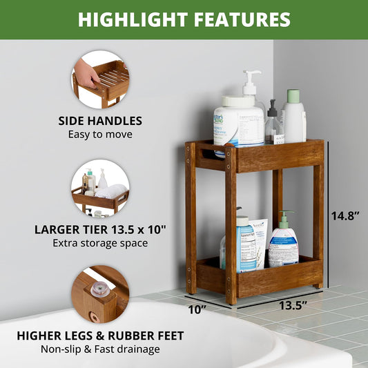 Carpentray Sheesham Wood Shower Caddy, 3 Tier Shower Organizer, Sturdy Corner Bath Caddy, Wooden Bathroom Shelves Freestanding, Teak Colored Bathroom Standing Shelf (2 Tier (10" D x 13.5" W x 14.8" H))