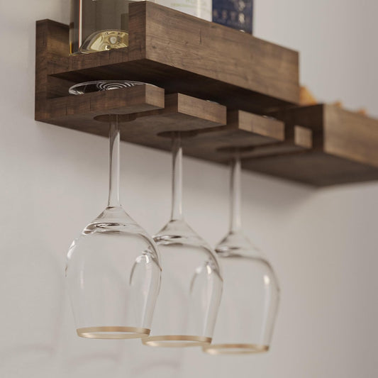 Carpentray Smith Wall Mounted Wood Floating Wine Bottle Rack with Glassware Holder Stemware Shelf Storage Organizer - Home, Kitchen, Dining Room Bar Décor - Walnut