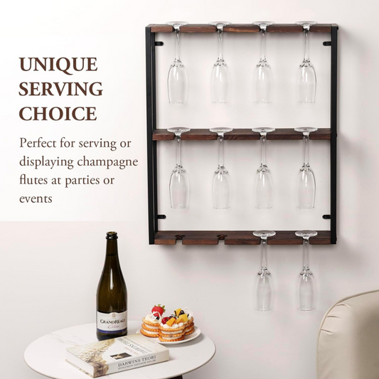 Carpentray Sheesham Solid Wood 3 Tier Wine Glass Holder, Wall Mounted Rustic Burnt Solid Wood and Industrial Matte Black Metal Hanging Stemware Storage Display Rack with 12 Slots
