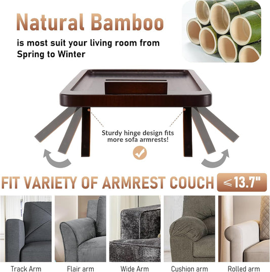 Carpentray Luxury Couch Arm Table Tray, Bamboo Sofa Arm Clip on Tray Table, Large Sofa Armrest Tray with 360°