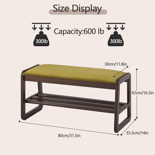 Carpentray Shoe Rack Entryway Shoe Storage Bench, End of Bed Bench with 2 Tier, 31.5'' Wooden Storage Ottoman Bench with Cushion for Living Room, Bedroom, Hallway (Olive Green)