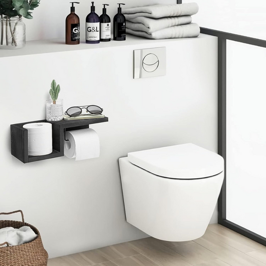 Carpentray Wooden Black Toilet Paper Holder with Shelf - Wall Mount Toilet Paper Holder Storage Rack for Tissue Rolls, Rustic Bathroom Washroom Decor Black