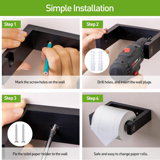 Carpentray Toilet Paper Holder with Shelf, Wooden Wall Mount Tissue Paper Roll Holder, 304 Stainless Steel Screw Wall Mounted, Tissue Roll Holder for Bathroom Washroom Matte Black