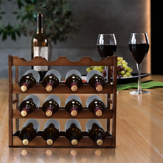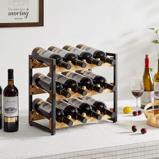 Carpentray 12-Bottle Wooden Wine Rack with Table Top (Black+Teak)